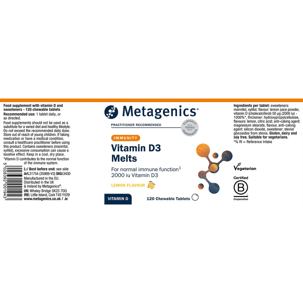 Provides 2000iu vitamin D3 in a small, lemon-flavoured melt, chewable or dissolvable sublingually. Ideal for year-round supplementation, especially in winter, for those who dislike liquids or tablets. Suitable for adults and children 6+, naturally sweetened