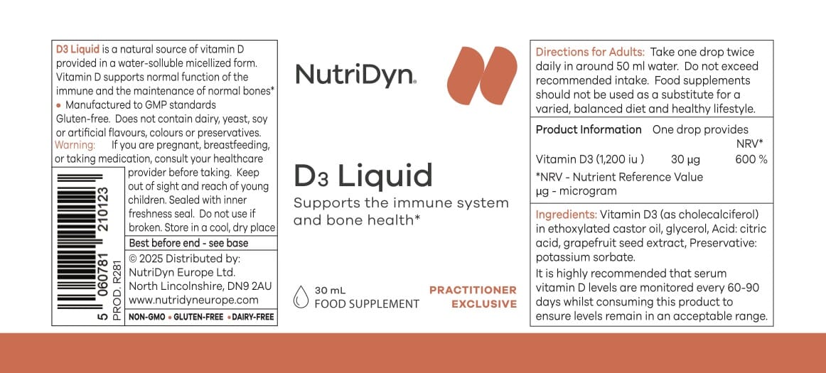 Vitamin D3 Liquid is a natural source of vitamin D provided in a water-soluble micellised form. Vitamin D supports normal function of the immune system and the maintenance of normal bones.