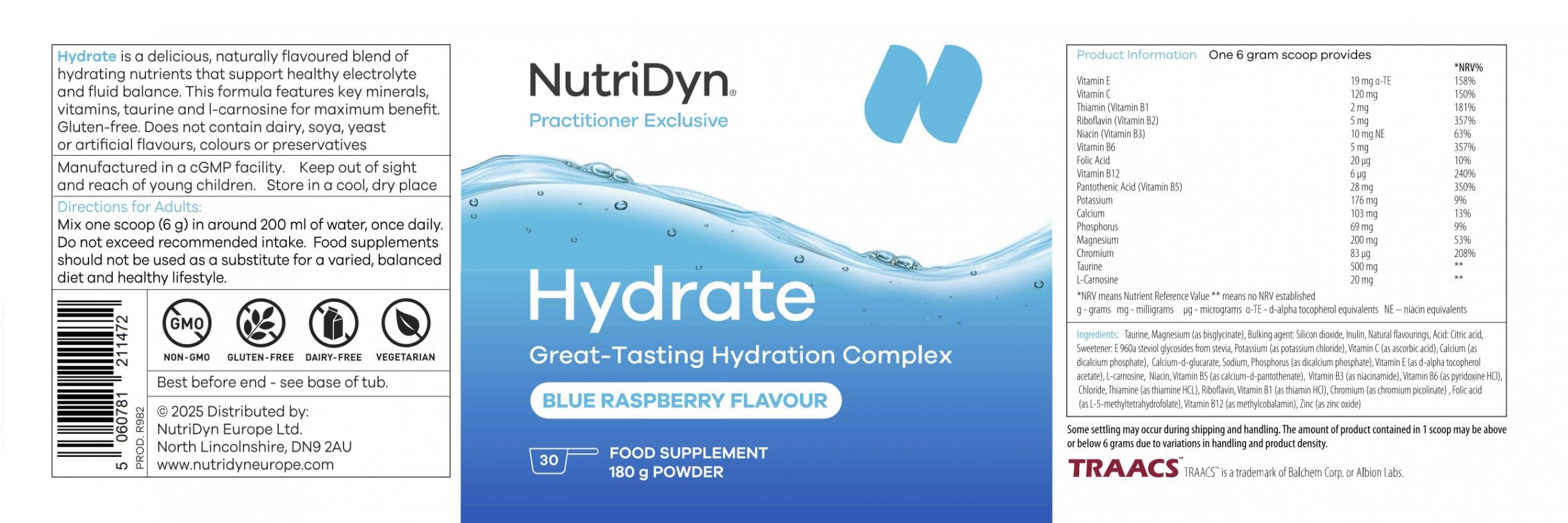 Hydrate is a delicious, naturally flavoured blend of hydrating nutrients that support healthy electrolyte and fluid balance. This formula features key minerals. vitamins, taurine and l-carnosine for maximum benefit. 30 servings.