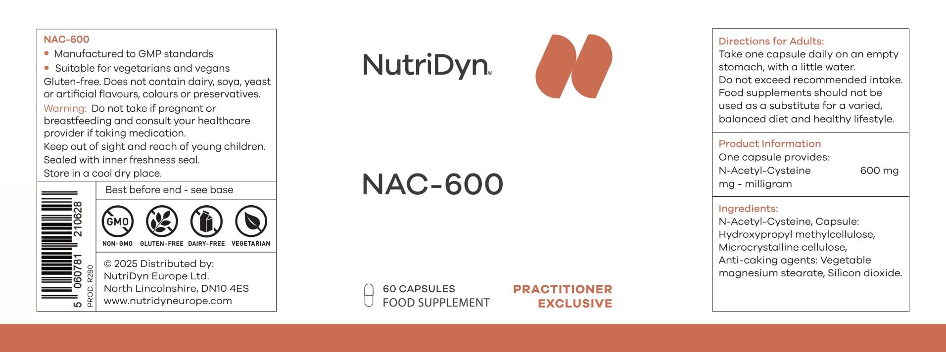 NAC-600 contains pharmaceutical grade N-acetyl-L-cysteine (NAC) for supporting glutathione synthesis in the body, a key tripeptide that has important antioxidant roles in humans. NAC is an acetylated version of the amino acid L-cysteine, which is the limiting factor to glutathione production.