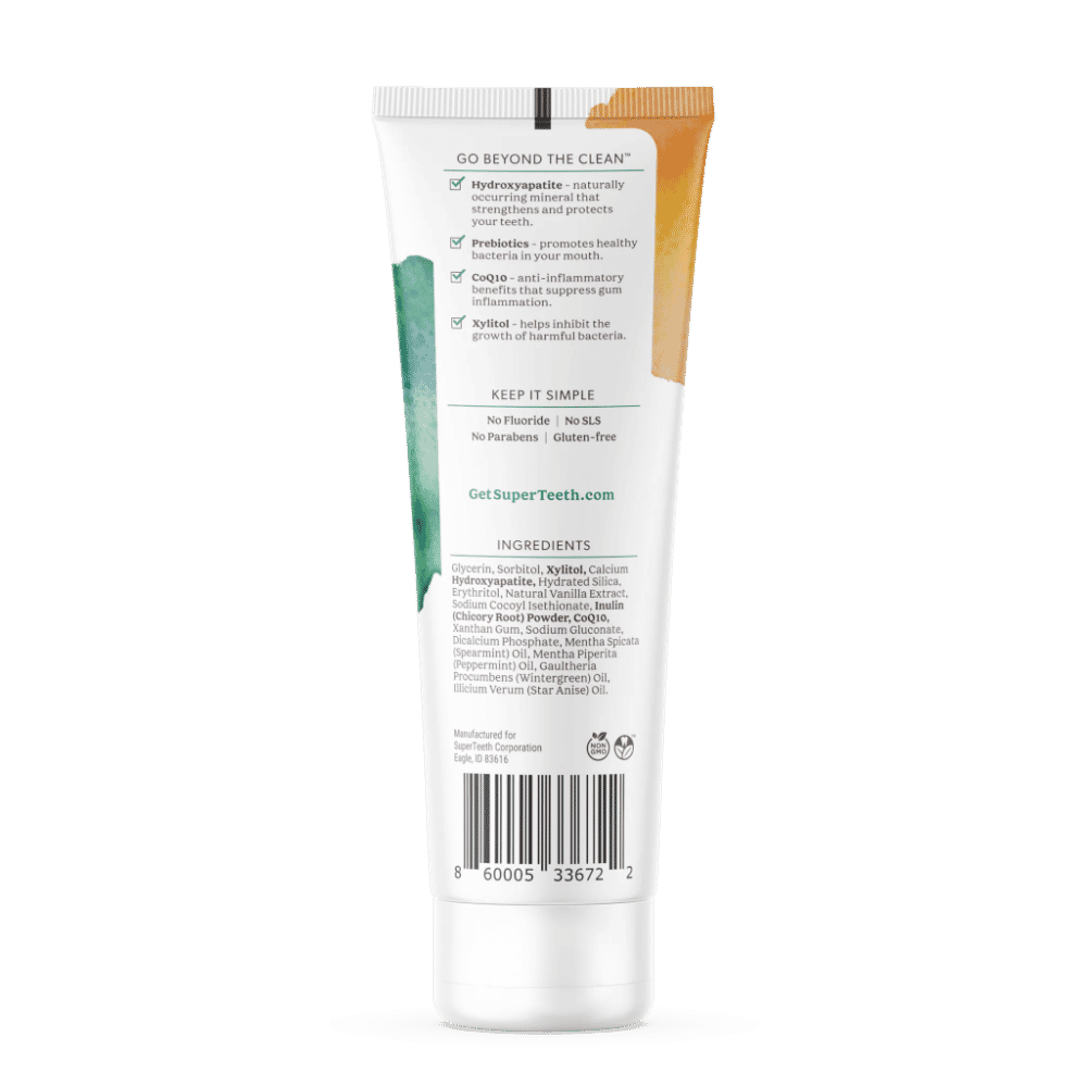 SuperTeeth's biocompatible, hydroxyapatite toothpaste cleans and strengthens teeth without fluoride, SLS, and other unnecessary ingredients. It also includes prebiotics to promote a healthy oral microbiome.