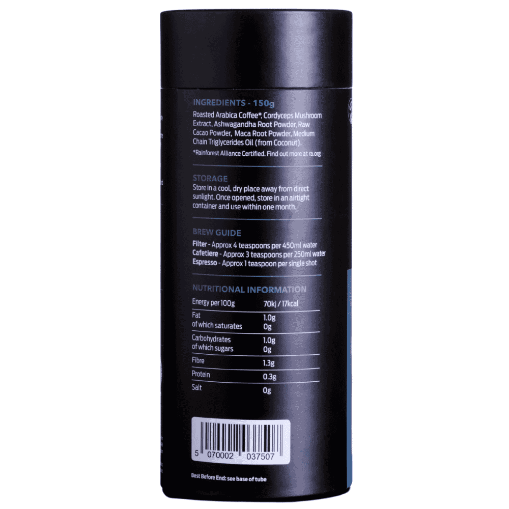 RFA* Roasted Arabica Coffee Single Origin from Brazil, Cordyceps Mushroom Extract, Ashwagandha Root Powder, Raw Cacao Powder, Maca Root Powder, Medium Chain Triglycerides Oil (from coconut)
