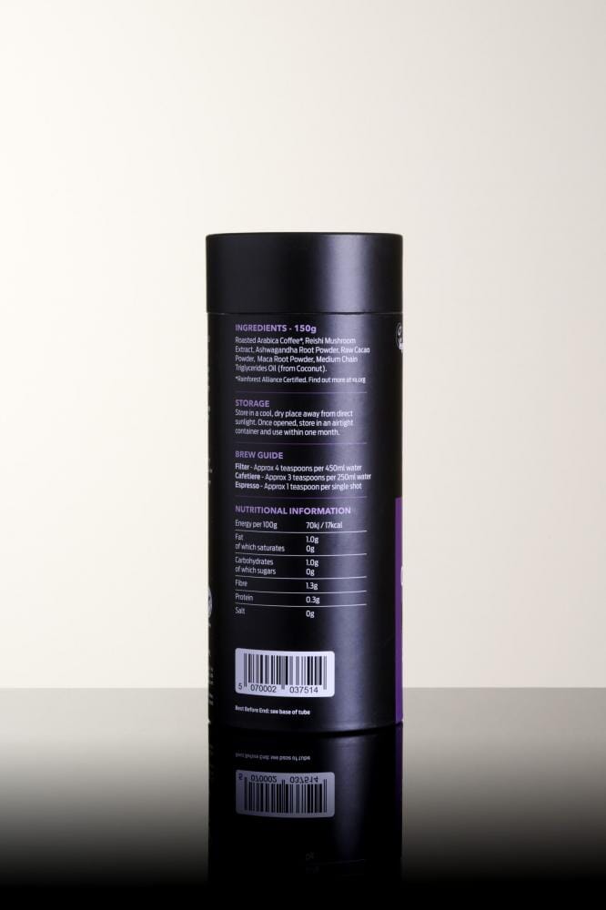 The reishi mushroom, also known as “the mushroom of immortality,” was traditionally reserved for royalty. Take time to savour this proper royal brew of Arabica single origin ground coffee from Brazil with reishi mushrooms, ashwagandha root powder, raw cacao powder, maca root powder and C8 MCT oil.