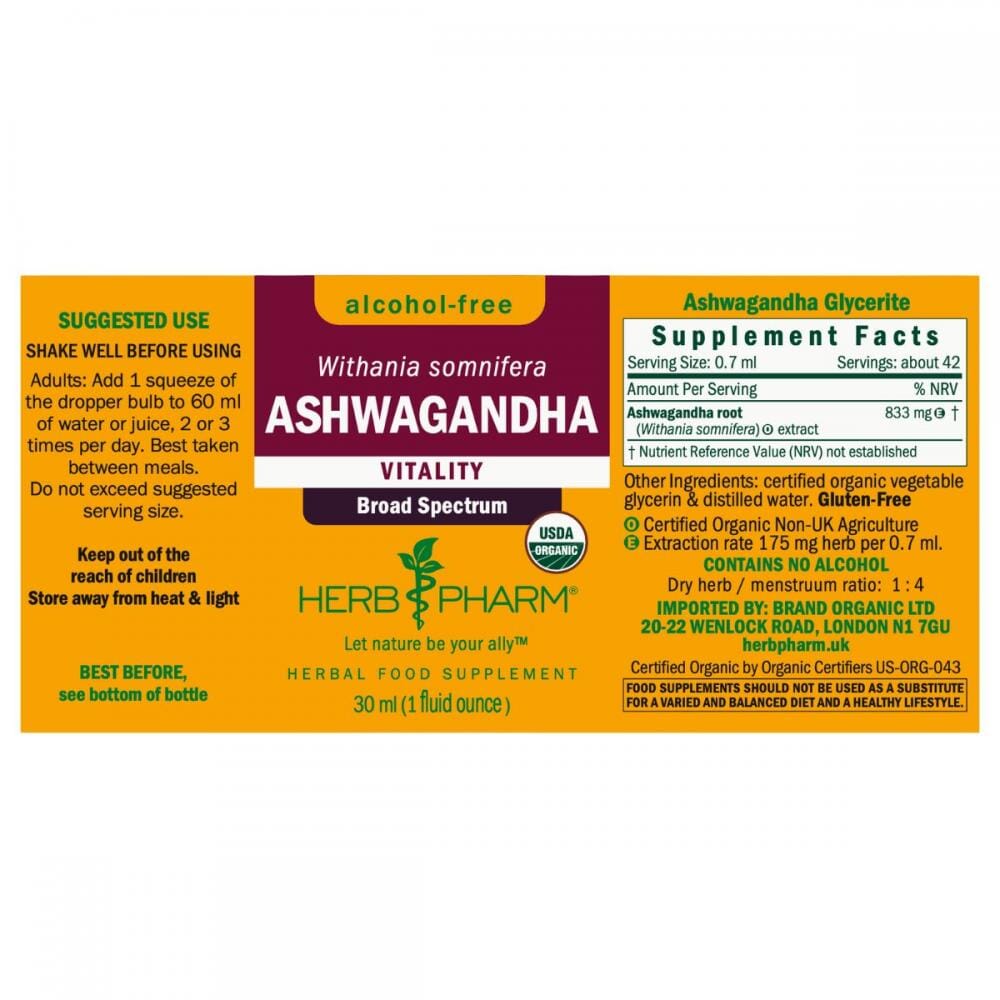 Herb Pharm's Alcohol-Free Ashwagandha is a broad-spectrum liquid herbal extract made from shade-dried roots of certified organic Withania somnifera, harvested at peak readiness to retain colour and aroma. Traditionally used to support vitality, it has an earthy, aromatic taste.