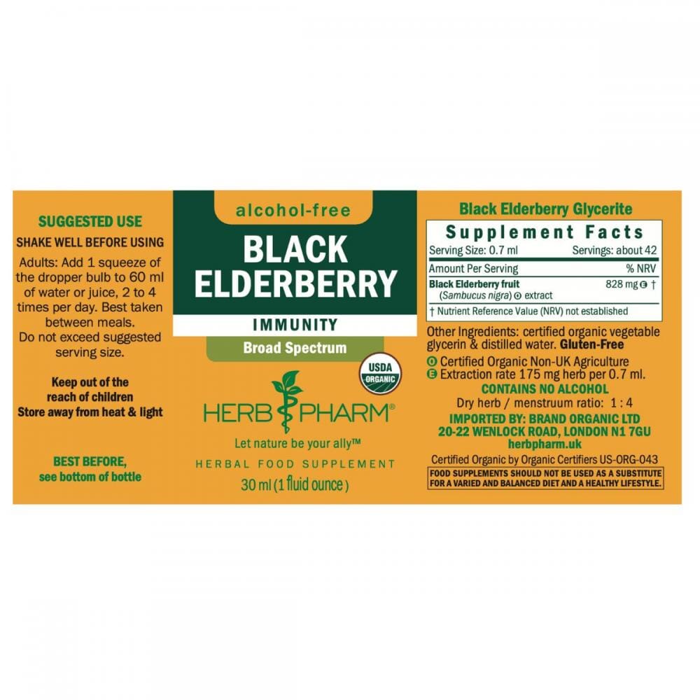 Herb Pharm's Alcohol-Free broad-spectrum Black Elderberry liquid herbal extract is made from FAIRWILD® Certified, organically grown ripe berries of Sambucus nigra, hand-harvested at peak ripeness. Traditionally used to support immune health.