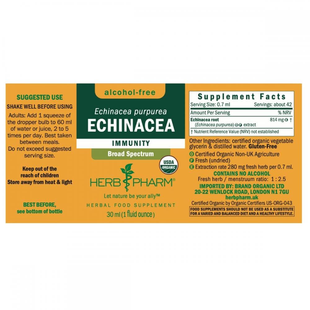 Herb Pharm's Alcohol-Free broad-spectrum Echinacea liquid herbal extract is made from fresh organic Echinacea purpurea roots, harvested in autumn and promptly extracted. Traditionally used to support overall health.