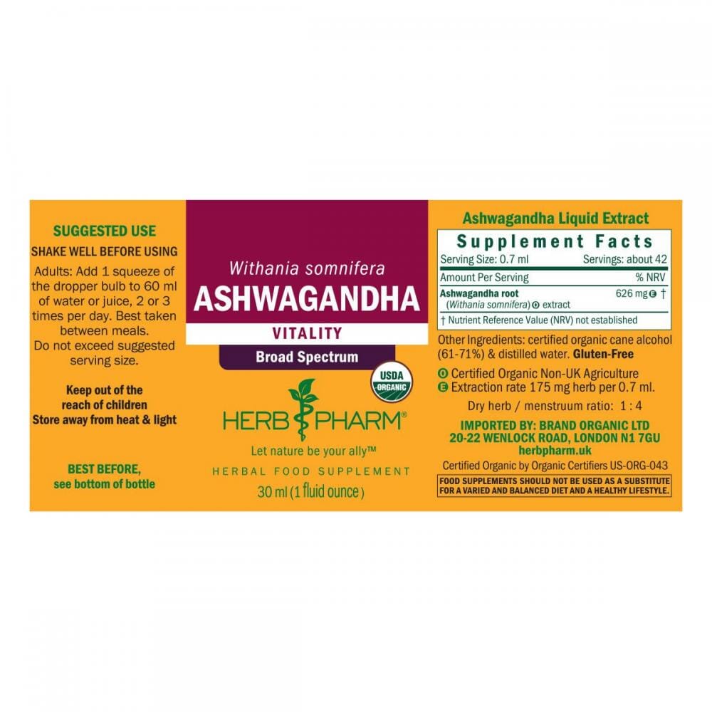 Herb Pharm's Ashwagandha is a broad-spectrum liquid herbal extract made from certified organic Withania somnifera roots, harvested at peak readiness and shade-dried to retain aroma and colour. Traditionally used to support vitality, ashwagandha has an earthy, aromatic taste with a slight bitterness.