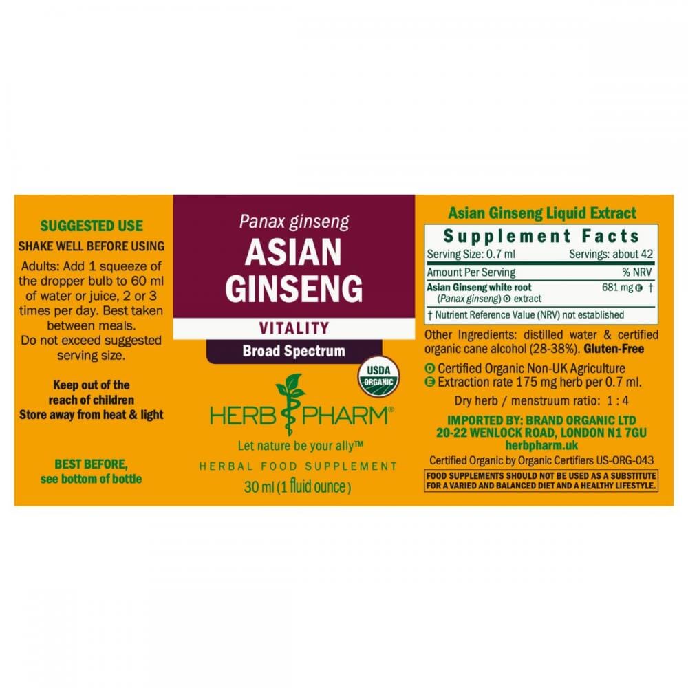 Herb Pharm's Asian Ginseng is a broad-spectrum liquid herbal extract made from the roots of certified organic Panax ginseng. Traditionally used to support vitality, it has a rich, earthy and aromatic taste.