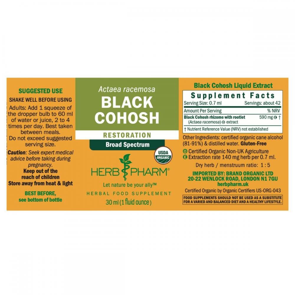 Herb Pharm's Black Cohosh is a broad-spectrum liquid herbal extract made from the rhizome and rootlet of certified organic Actaea racemosa. Traditionally used to support menopause, it has an aromatic, bitter taste.