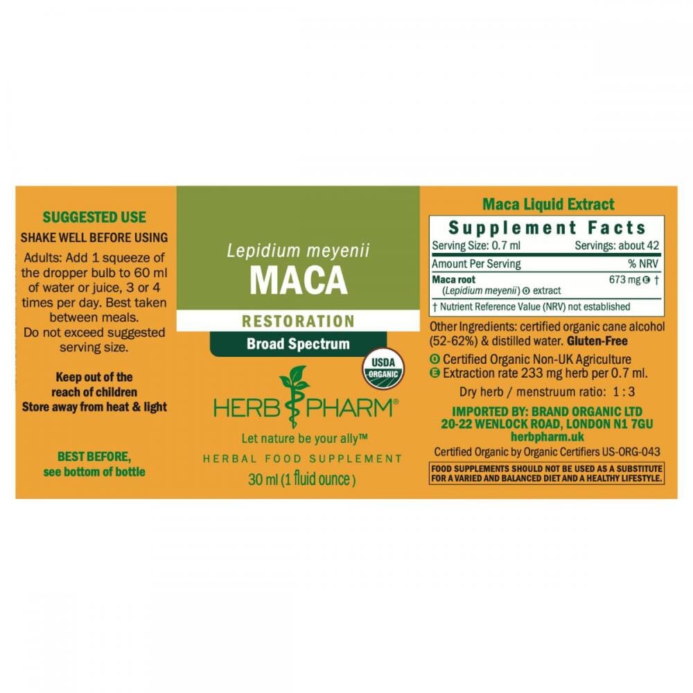 Herb Pharm's Maca is a broad-spectrum liquid herbal extract made from dried roots of certified organic Lepidium meyenii. Traditionally used to help restore wellness, maca tastes rich and sweet, with rooty notes and a hint of butterscotch.