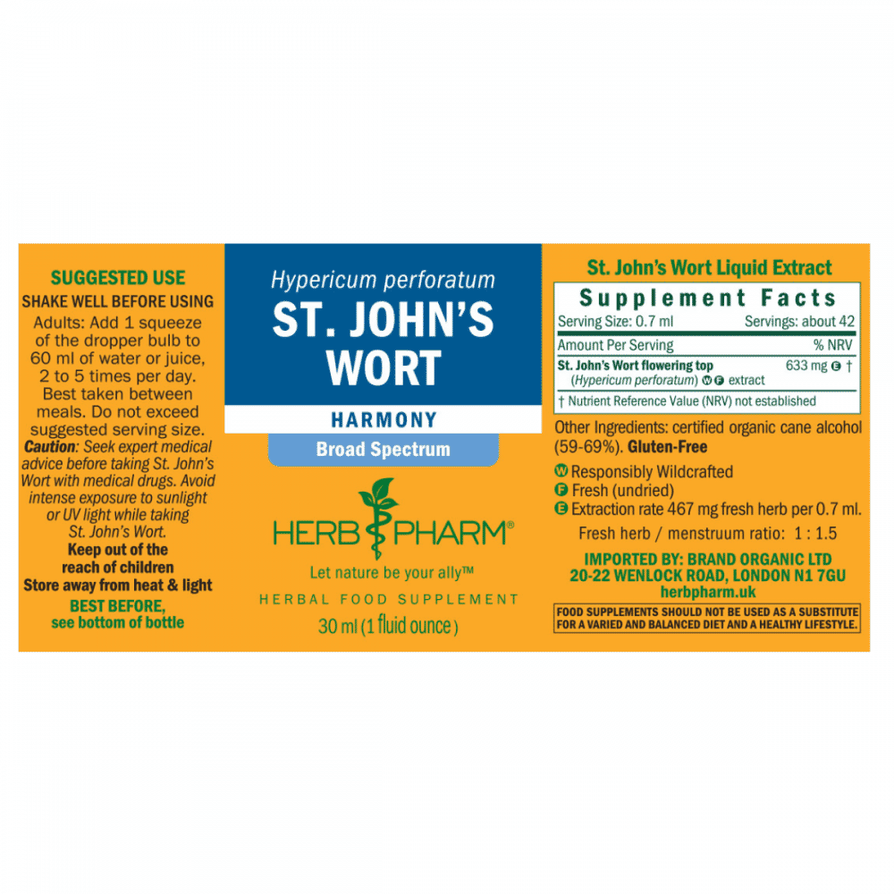 St. John's Wort flowering top (Hypericum perforatum) extract Responsibly Wildcrafted, fresh (undried), certified organic cane alcohol (59-69%)