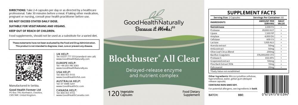 Blockbuster® All Clear includes nattokinase with digestive enzymes, grapeseed extract and pine bark extract 95% and much more. This unique combination supports various conditions and may benefit heart and cardiovascular health.