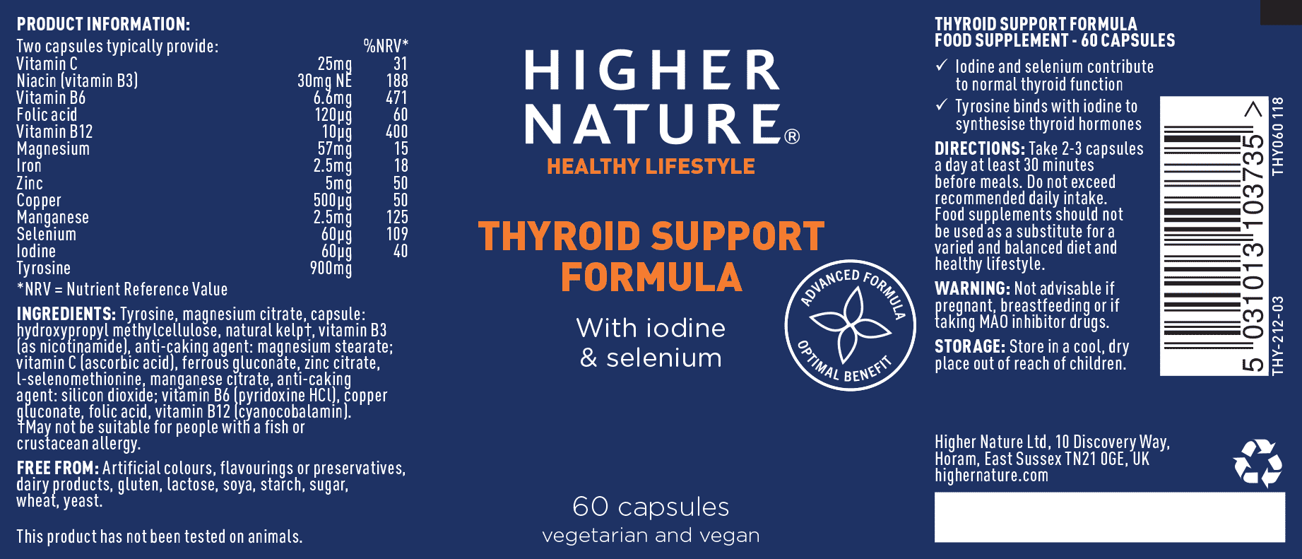 Provides essential nutrients that are key to support thyroid health. These include the amino acid tyrosine, minerals iodine, selenium and zinc, along with nine other essential nutrients. The thyroid gland plays a major role in our metabolism, growth and development and energy production.