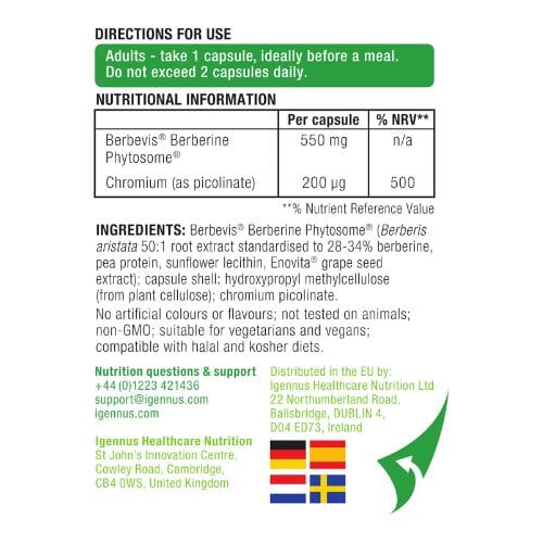 Berbevis® Berberine Phytosome® (Berberis aristata 50:1 root extract standardised to 28-34% berberine, pea protein, sunflower lecithin, Enovita ® grape seed extract); capsule shell: hydroxypropyl methylcellulose (from plant cellulose); chromium picolinate
