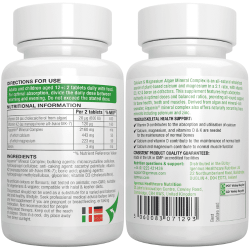Aquamin® Mineral Complex; bulking agents: microcrystalline cellulose, hydroxypropyl cellulose; anti-caking agent: ascorbyl palmitate; vitamin K2 (menaquinone all-trans MK-7); boric acid; glazing agents: hydroxypropyl methylcellulose, glycerine; vitamin D3 (cholecalciferol).