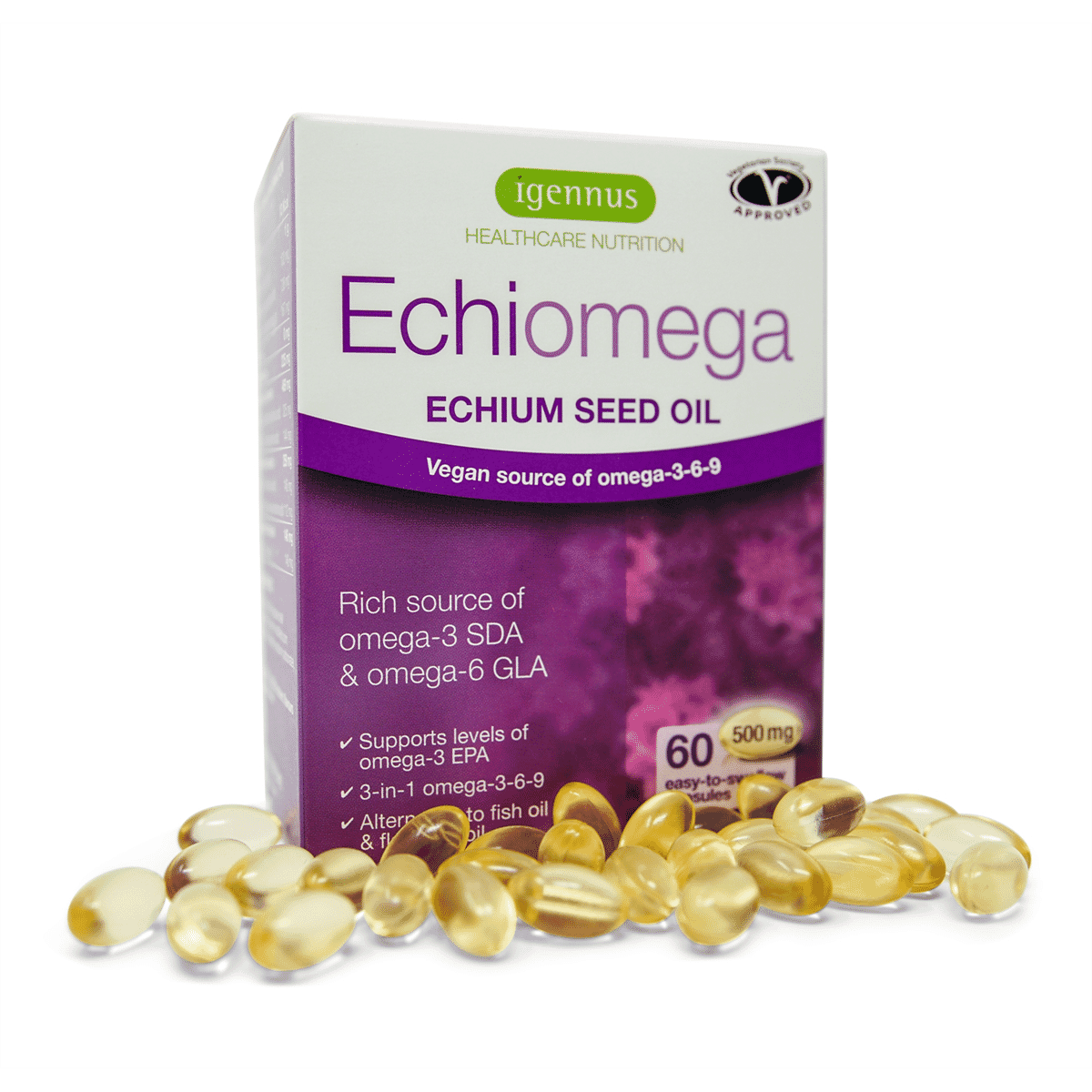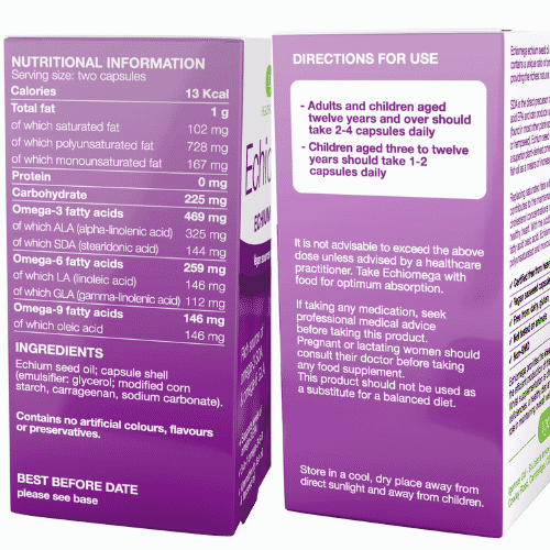 Echiomega echium seed oil is a complete source of omega-3-6-9 good fats. Its unique content of ALA & SDA boosts levels of the important omega-3 EPA 60% more than other plant oils such as flaxseed.