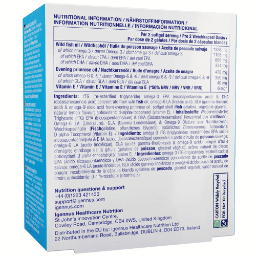 rTG (re-esterified triglyceride) omega-3 EPA (eicosapentaenoic acid) & DHA (docosahexaenoic acid) concentrate from wild fish oil; omega-6 LA (linoleic acid), GLA (gamma-linolenic acid) & omega-9 oleic acid from evening primrose oil; softgel shell (fish gelatine, vegetable glycerol); natural lemon flavour; antioxidant: d-alpha-tocopherol (vitamin E).