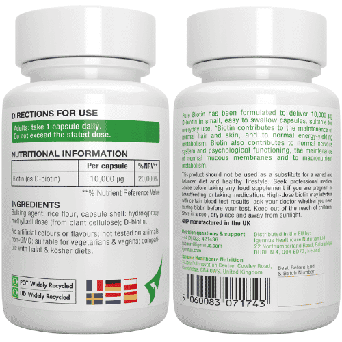 Pure Biotin has been formulated to deliver 10,000μg D-biotin - an effective daily dose supporting biotin levels within the body. Biotin has multiple functions in the body and supports skin, hair and nails, energy and metabolism, mood and the nervous system.