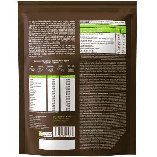 Proprietary Igennus ® Blend PlantProColl ® plant-based peptide blend: brown rice protein, pea protein, pumpkin seed protein, sunflower seed protein, glycine, hydroxyproline, proline; natural vanilla flavouring; thickener: xanthan gum; vitamin C (ascorbic acid)