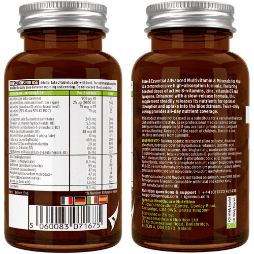 Pure & Essential Methylated Multivitamin and Minerals for Men is a high-absorption multi-nutrient supplement without iron formulated to provide comprehensive nutritional support for adult men of all ages.