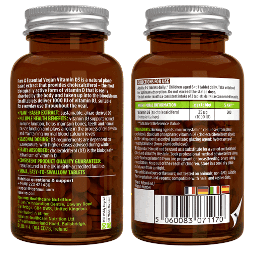 Pure & Essential Vegan Vitamin D3 is a natural plant-based extract from lichen, a type of fungi that provides cholecalciferol – the most biologically active form of vitamin D that is easily absorbed by the body. Small tablets deliver 1000 iu of vitamin D3, suitable for everyday use.