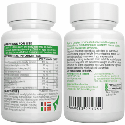 Super B-Complex contains 8 highly bioavailable B-vitamins with vitamin C. This pre-methylated B-Complex contains all the B vitamins in their most active, body-ready forms, at dosages safe for long term use.