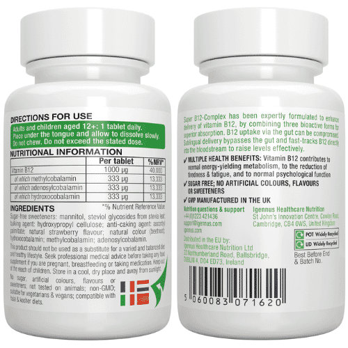 Super B12-Complex has been expertly formulated to effectively support cellular levels of this essential nutrient. The superior sublingual format delivers vitamin B12 directly to the bloodstream, bypassing absorption challenges in the gut.