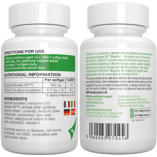 Rapid-action VESIsorb® Ubiquinol-QH is the most advanced Coenzyme Q10 (CoQ10) supplement available. Its fast-track patented VESIsorb® delivery system ‘pre-digests’ ubiquinol for unprecedented absorption and higher blood plasma levels.