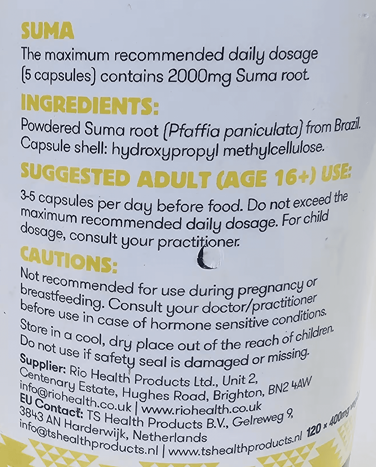 Naturally contains phyto-oestrogens. Do not use with oestrogen-positive cancers. Best to take Suma away from vitamin C foods/products.