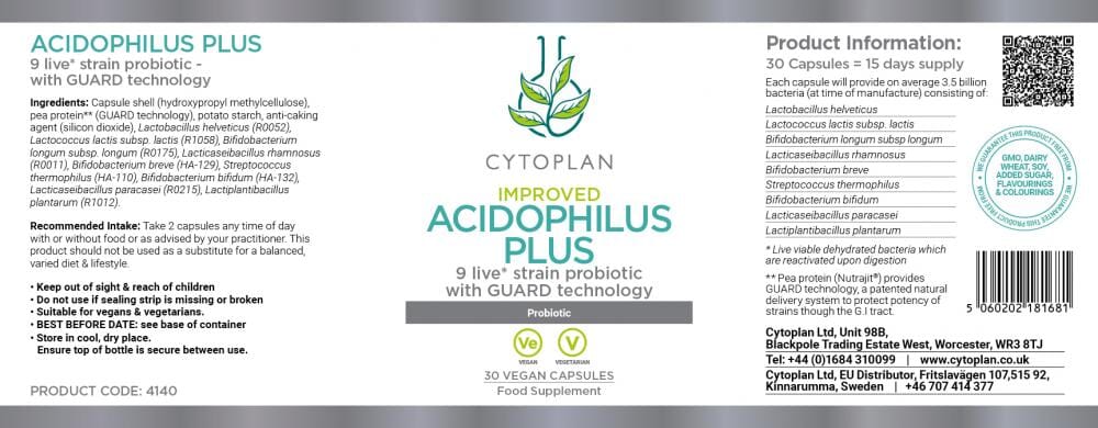 Improved formula. Acidophilus Plus now utilises GUARD technology; a patented, innovative and natural technology proven to protect the bacterial strains from stomach acid and enable their timed release within the intestines.