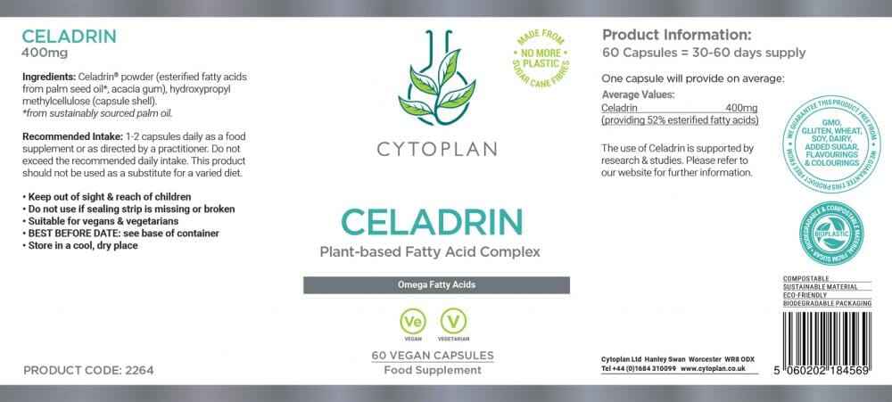 Celadrin®️ powder (esterified fatty acids from palm seed oil*, acacia gum), HPMC (vegetable cellulose, capsule shell)