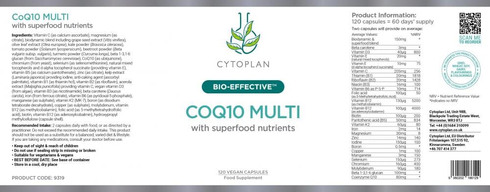 CoQ10 Multi is Cytoplan's most comprehensive multivitamin and mineral supplement, now formulated with a UK first biodynamic and superfood fruit, vegetable and herb blend, which is especially rich in phytonutrients and active compounds.