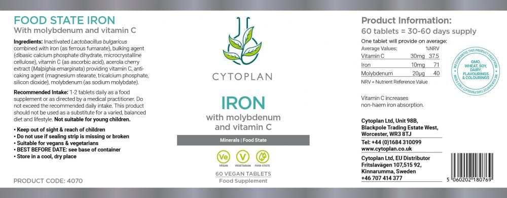 Food State™ Iron is presented to the body in a live culture complex and thus is a gentle, non-constipating and well absorbed supplement. Wholefood vitamin C and molybdenum are added to aid the absorption and utilisation of the iron.