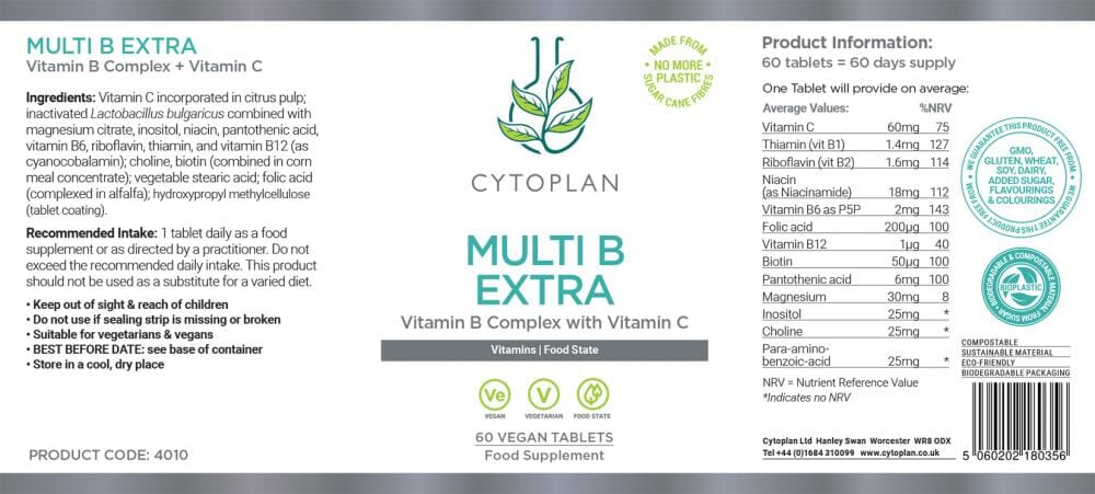 This Food State supplement contains all of the essential B vitamins at around 100% of the Nutrient Reference Value (NRV), and also includes several non-B vitamins, specifically vitamin C.