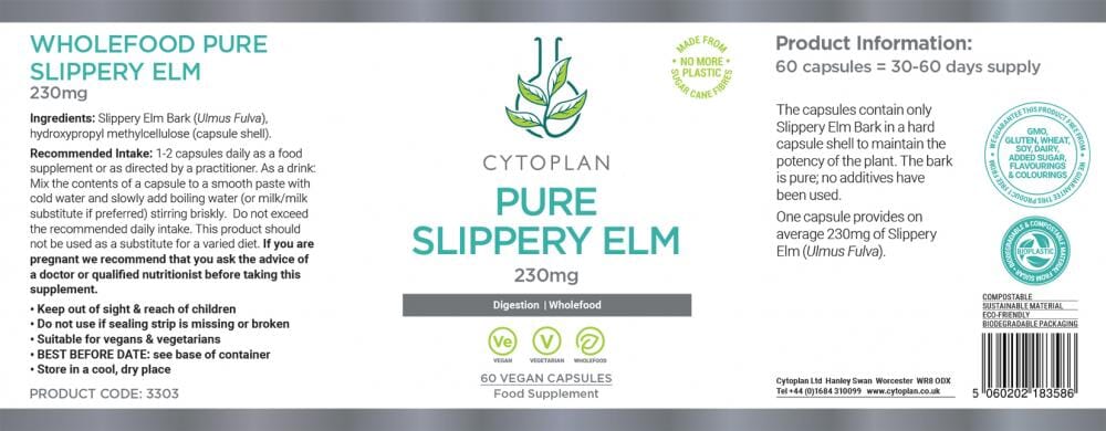 Each capsule contains only Slippery Elm Bark to maintain the potency of the plant. The bark is pure and no additives have been used. One capsule of Slippery Elm Bark contains on average 230mg of Slippery Elm (Elmus Fulva).