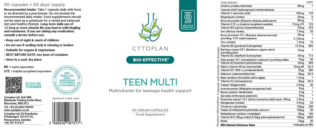 A complete multivitamin and mineral formulated especially for teenagers, with bio-effective nutrient forms, essential iron and a blend of phytonutrients to support health and wellbeing.