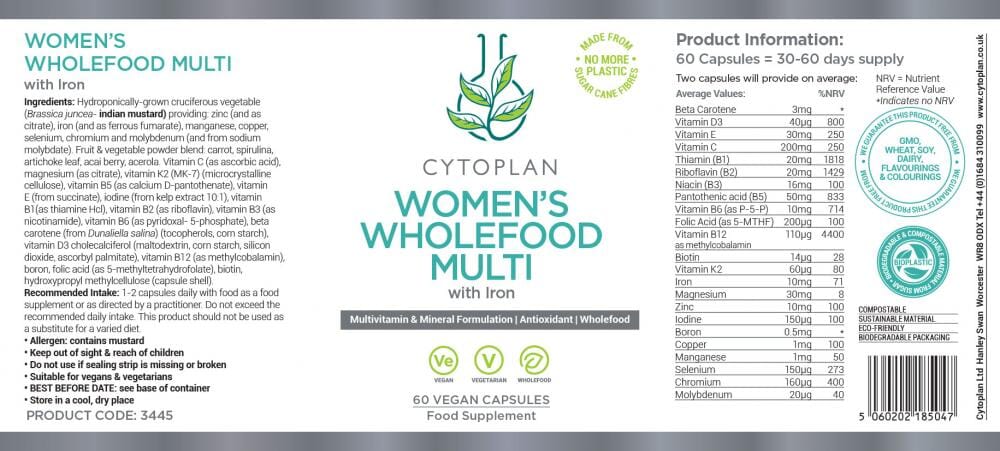 Women's Wholefood Multi with Iron is a comprehensive Wholefood multivitamin and mineral supplement providing 5mg of iron per capsule (in the form of ferrous fumarate), alongside antioxidants, vitamin D and chromium. Ideal for teenagers, menstruating women or those with low iron levels.