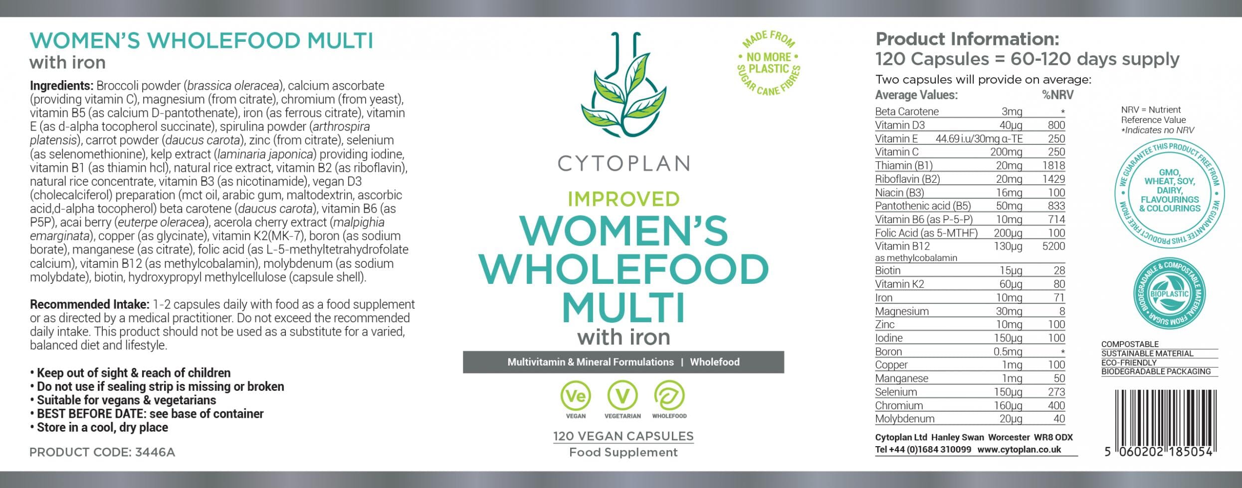 Women's Wholefood Multi with Iron is a comprehensive wholefood multivitamin and mineral supplement providing 5mg of iron per capsule (in the form of ferrous fumarate), alongside antioxidants, vitamin D and chromium. Ideal for teenagers, menstruating women or those with low iron levels.
