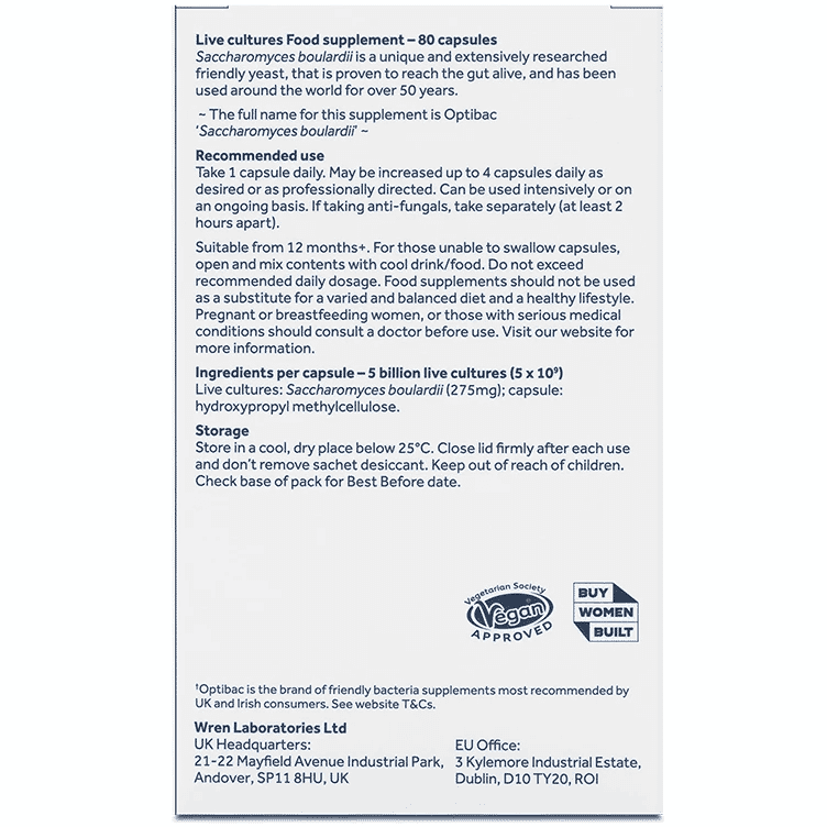 Unique microorganism, introduced to the UK by OptiBac, 5 billion live cultures guaranteed per capsule. It does not interfere with other supplements, is well researched and used safely across the world for the last 50 years.