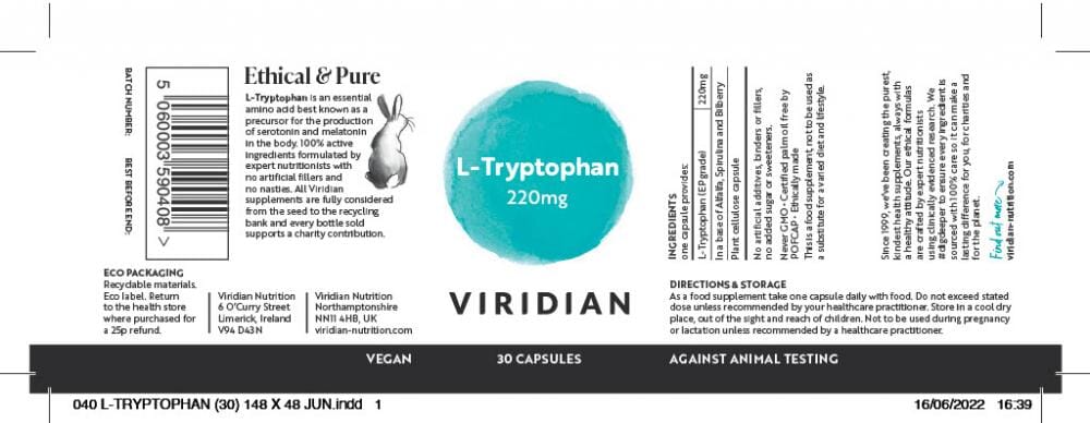 L-Tryptophan (EP grade) in a base of alfalfa, spirulina and bilberry, plant cellulose capsule. Viridian's L-Tryptophan is exclusively European Pharmacopoeia grade material.