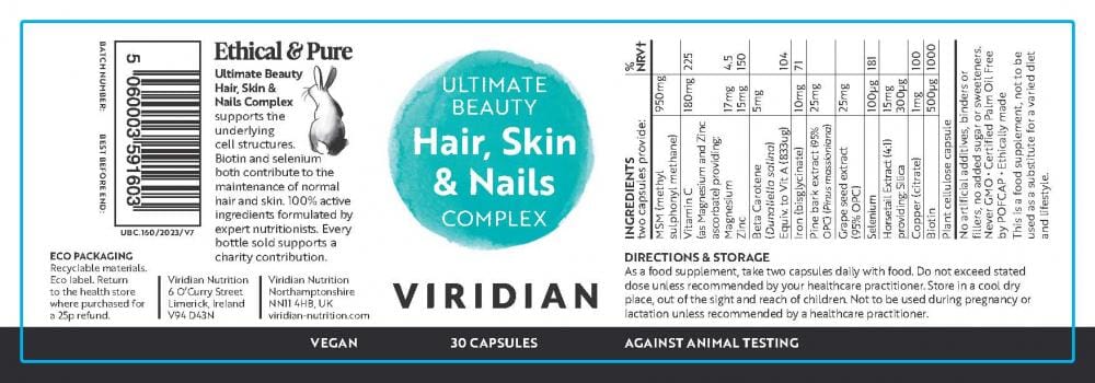 A combination of vitamins, minerals and plant-based phytonutrients to support the underlying structures of healthy skin, hair and nails. Take daily alongside Viridian's Ultimate Beauty Complex Oil for the ultimate in hair, skin and nails.