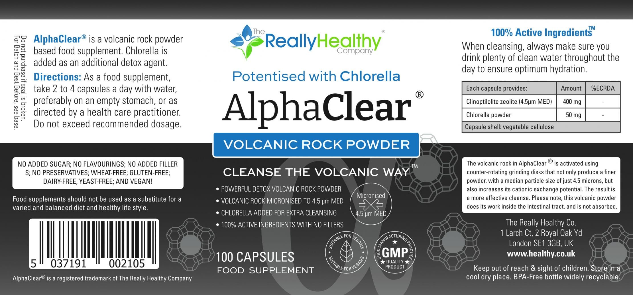 AlphaClear combines together the detox benefits - Super- fine (4.5 um MED) high grade volcanic rock powder with cracked cell wall chlorella.