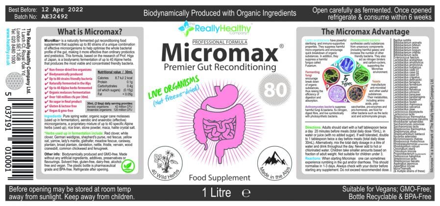 Production Notes: The molasses is used as a fuel source for the microbes during production and is not present in the final product fermentation process. This means that Micromax has a very low sugar content and is therefore safe for diabetics. The other nutritive ingredients — the herbs, maca, rice bran, stone powder and halite crystal salt — are provided to allow the microbes to reach their full vitality, and so are also used up or filtered out during production.