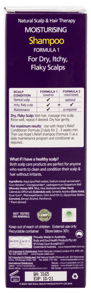Hope’s Relief Shampoo is for itchy flaky scalps. Suitable for babies to adults. Contains hospital grade organic manuka honey UMF 10+ and other active ingredients.