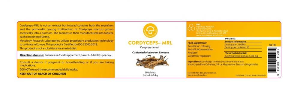 Cordyceps-MRL (Cordyceps sinensis) tablets contain both mycelium and primordia (young fruit body) cultivated into a biomass that is grown on a sterilised (autoclaved) substrate in the EU. The tablets are certified to ISO 22000:2018 standard.