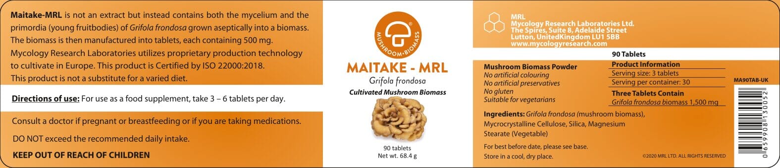 Maitake-MRL tablets (Grifola frondosa) contains both mycelium and primordia (young fruit body) cultivated into a biomass that is grown on a sterilised (autoclaved) substrate in EU. The tablets are certified to ISO 22000:2018 standard.