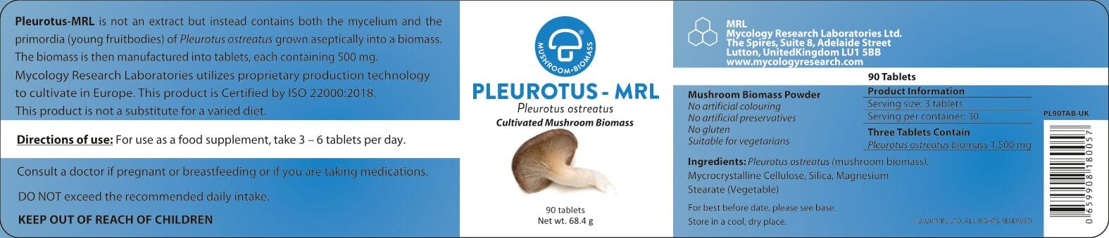 Pleurotus-MRL tablets (Pleurotus ostreatus) contains both mycelium and primordia (young fruit body) cultivated into a biomass that is grown on a sterilised (autoclaved) substrate in California. The tablets are certified to ISO 22000:2018 standard.
