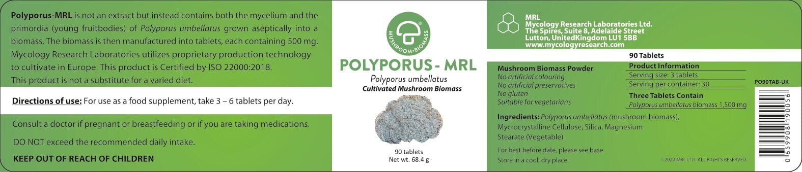 Polyporus-MRL (Polyporus umbellatus) tablets contain both mycelium and primordia (young fruit body) cultivated into a biomass that is grown on a sterilised (autoclaved) substrate in California. The tablets are certified to ISO 22000:2018 standard.