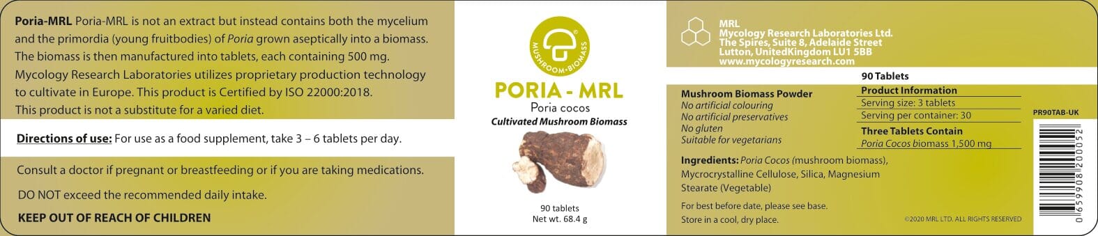Poria-MRL tablets (Poria cocos) contains both mycelium and primordia (young fruit body) cultivated into a biomass that is grown on a sterilised (autoclaved) substrate in California. The tablets are certified to ISO 22000:2018 standard.