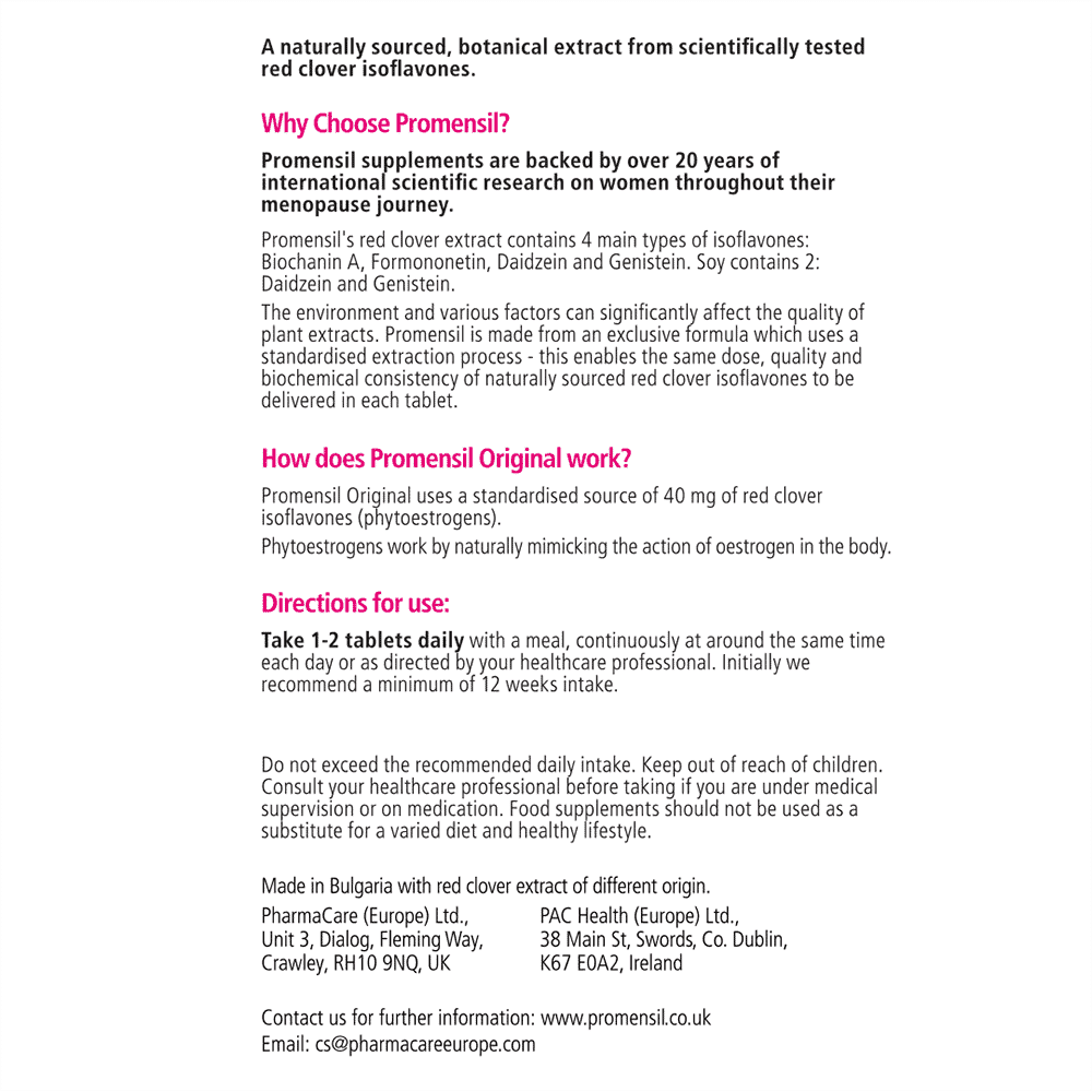 Promensil Original is specifically formulated to provide 40mg of standardised Red Clover Isoflavones (phytoestrogens) which work from within. Highly recommended for women throughout menopause as a maintenance dose but can be used peri-menopause and post-menopause.